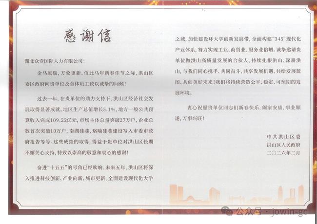 2025年2月26日,武汉市洪山区重点项目推进暨高质量发展大会隆重召开。大会聚焦重点项目建设与区域高质量发展,对先进企业进行通报表彰,众壹公司受邀参会,并获评产业发展特色贡献企业,位列第37位,彰显我司在服务地方产业发展中的积极作为与行业认可。