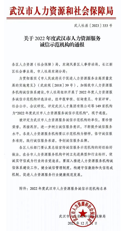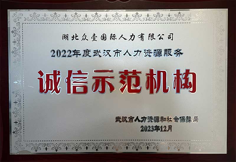 武汉市人力资源和社会保障局《关于2022年度武汉市人力资源服务诚信示范机构的公告》,公布了2022年度武汉市人力资源服务诚信示范机构名单,其中湖北众壹国际人力有限公司荣获此殊荣!