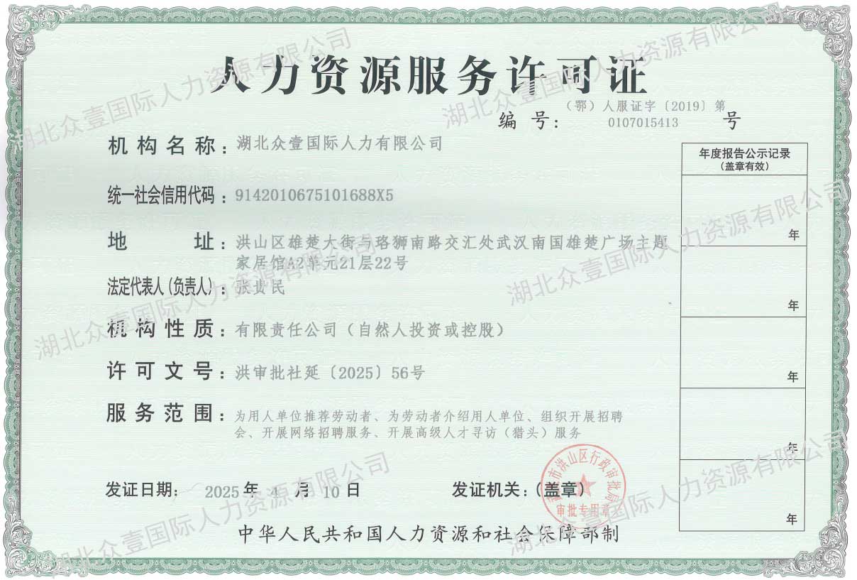 湖北众壹国际人力有限公司成立于2003年7月1日,是一家由中华人民共和国商务部颁发对外劳务合作(外派劳务)经营资格证书(证书号:LW420020240001)的劳务公司,公司注册资金人民币600万,2010年公司已通过国际ISO9001质量管理体系认证。公司选址华中腹地重镇,素有"九省通衢"之称,航空、铁路、公路、水运交通四通八达,具有通江达海、承东启西、沟通南北、得天独厚区位优势的武汉市。办公地点湖北省武汉市洪山区珞狮南路南国雄楚广场A2栋2123室。